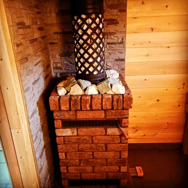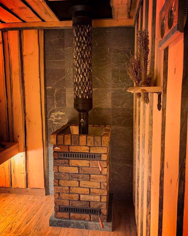 Облицовка банной печи выполнена из прочного, энергоемкого и излучающего приятное тепло, классического кирпича ручной формовки.
